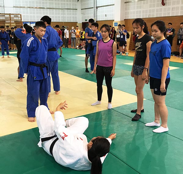 26日上午,交流團來到香港馬會奧林匹克運動學校,與該校師生進行了柔道、摔跤、跆拳道、武術、足球等項目的演示和訓練,在得到鍛煉的同時也獲取了友誼,隨後雙方互贈紀念品並合影留念。