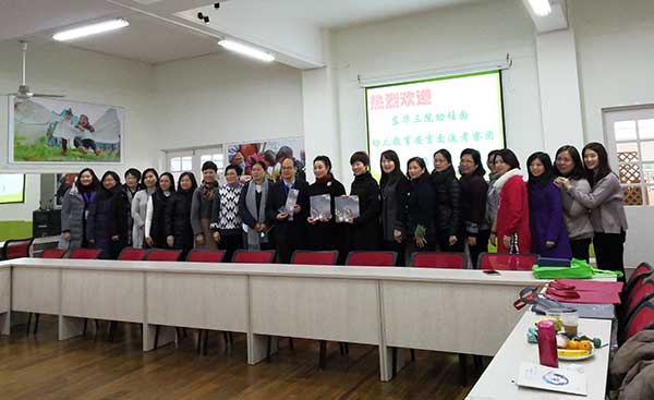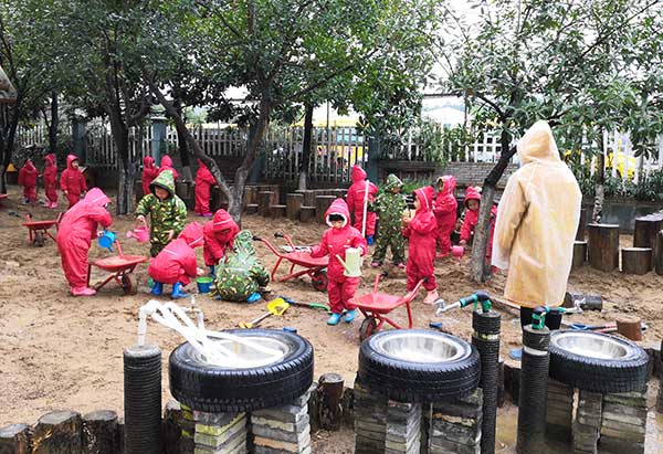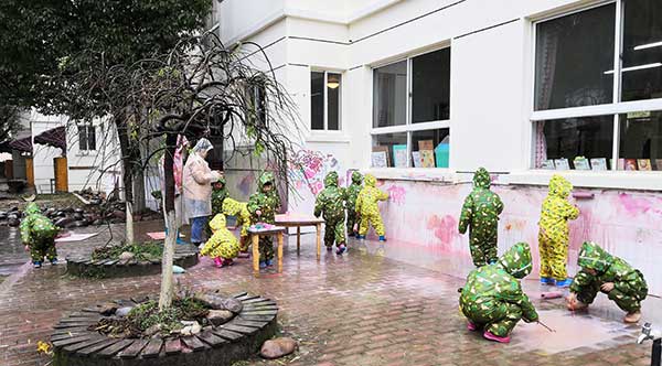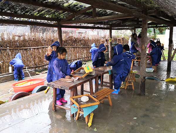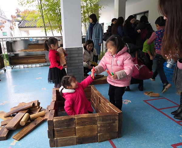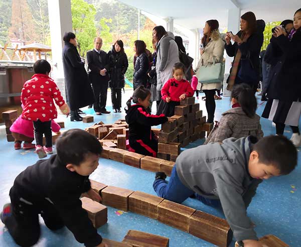交流團來先後來到安吉雙一幼兒園、紫梅幼兒園、安吉縣機關幼兒園,根據安吉的山區特點,當地幼兒園就地取材,一般設立塗鴉、廢舊工廠、大沙水池、戶外建築等寓娛樂於教育的野趣遊戲區,孩子們可以自由地選擇材料、同伴,根據自己的意願和需要,在和同伴互動、與材料互動的過程中學習與發展。考察團一行觀察幼兒是如何發揮自己的想象開展各種自主自由的遊戲,並與當地幼兒園校長老師進行交流和互贈紀念品。