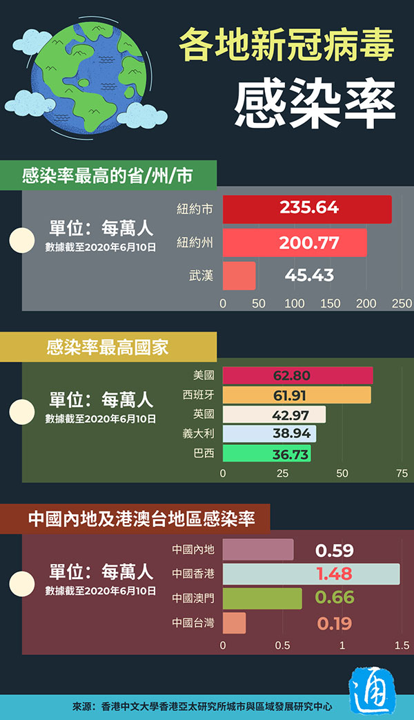 根據6月10日各地新型冠狀病毒感染率與感染風險的數據顯示,每萬人感染率最高的是紐約市(235.64),其次為紐約州(200.77),接著是美國(62.80)、西班牙(61.91)與武漢(45.43)。中國內地每萬人的感染率則只有0.59個,低於香港每萬人1.48個的感染率。