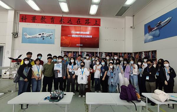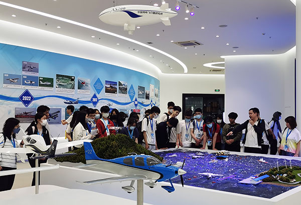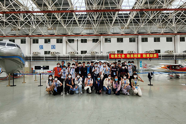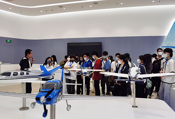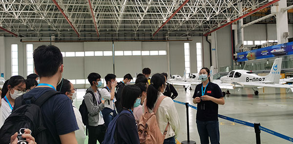 第二站:航空文化展廳。展廳內,基地金牌講師詳盡的講解,讓考察團親身接觸和了解西銳SR20、SR22、小鷹500、運5B、運15-2000、海鷗300水路兩棲飛機等多種機型,認識飛機的種類、結構和生產過程,以及認識飛行的原理和技術。