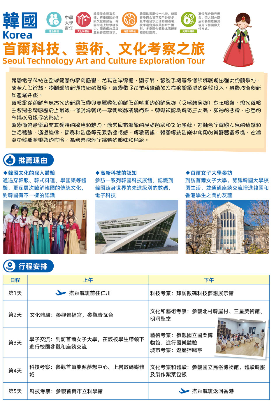 ★通過穿韓服、跳扇子舞、學國樂等體驗,更深層次瞭解韓國的傳統文化,對韓國有不一樣的認識;