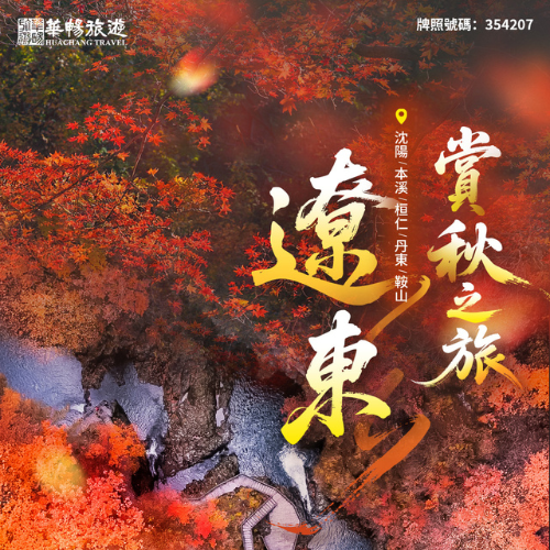 ◆漫步【沈陽故宮】紅牆金瓦,觸摸「清韻遺風」,晨光熹微處,再現盛京皇城氣象 ◆泛舟【本溪水洞】地下銀河,驚歎「鐘乳奇觀」,碧波蕩漾處,邂逅喀斯特秘境 ◆秋染【關門山國家森林公園】,醉賞「楓瀑交響」,層林盡染時 ...